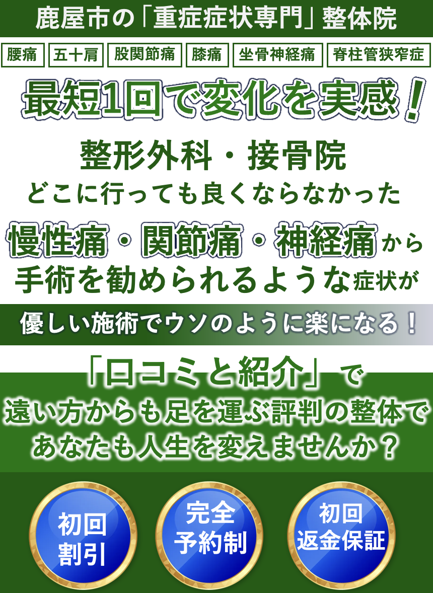 どこへ行ってもよくならない慢性症状や長年改善していないもの、重度の腰痛、脊柱管狭窄症、ヘルニア、坐骨神経痛、頭痛、首肩痛、うつ、アトピー、歩行困難